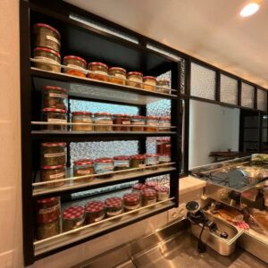 Todos los muebles cuentan con esquinas redondeadas, superficies lisas y detalles pensados para evitar la acumulación de residuos. Las rejillas, estantes y bandejas internas son extraíbles, lo que facilita el mantenimiento diario.
