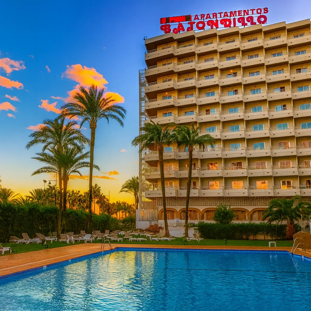 El Hotel Apartamentos Bajondillo está situado en primera línea de playa en Torremolinos, con apartamentos con vistas al mar y una amplia oferta de servicios para toda la familia. Cuenta con piscina en jardines, restaurante, cafetería, chiringuito, espectáculos en vivo, animación infantil en verano y sala de juegos. Ofrece recepción 24h, hamacas, biblioteca, servicio médico y actividades culturales. Frente al hotel se accede directamente al paseo marítimo y a las playas limpias de la Costa del Sol, lo que lo convierte en un lugar ideal para relajarse y disfrutar durante todo el año.